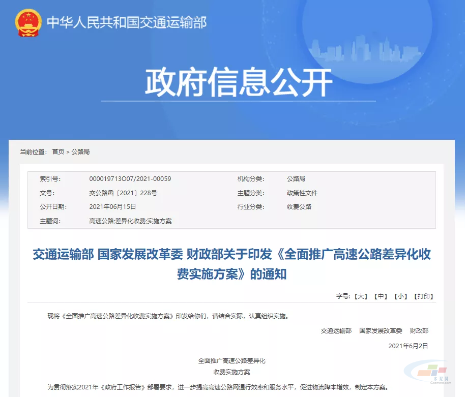 據(jù)中國(guó)水泥網(wǎng)消息,6月2日,交通運(yùn)輸部、國(guó)家發(fā)展改革委、財(cái)政部聯(lián)合印發(fā)《全面推廣高速公路差異化收費(fèi)實(shí)施方案》的通知(以下簡(jiǎn)稱:《通知》)。